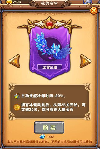 非常强大的一只宠物,需要880钻石才能购买,拥有三条强力属性,其一为出站时对蓝色头目增加30%伤害,其二为主动技能冷却时间-20%,其三为25关开始,每突破20关都将得到打量金币。这只宠物,完全是为了打BOSS而生。