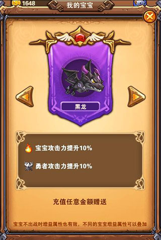充值任意金额送的强力宠物,这只宠物可以增加勇者10%的攻击,同时增加宝宝10%的攻击,是一只比较优良的宠物。