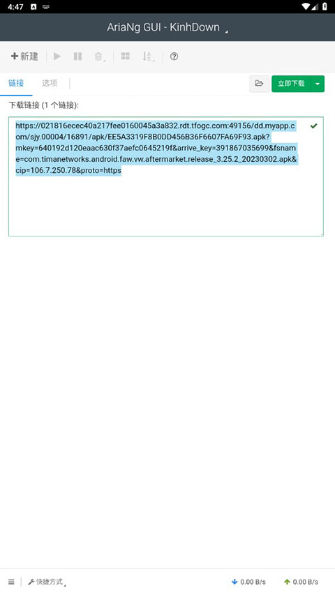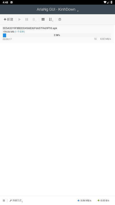 AriaNgGUI手机版是一款运行在手机端的Aria2一键启动图形界面客户端。它是一款优秀的网盘不限速下载工具,拥有友好的操作界面,能够帮助用户轻松下载各种资源文件,且下载速度不受任何的限制,非常实用。AriaNgGUI手机版能够支持HTTP/HTTPS,FTP,SFTP,bt和Metalink等多种协议,支持磁力链接、BT种子、http等类型的文件下载,与国内迅雷相比,AriaNgGUI手机版有着优秀的性能及较低的资源占用,架构本身非常轻巧,可以从多个来源、多个协议下载资源,最大的程度上利用了你的带宽。支持多线程下载,满足用户的下载需求。