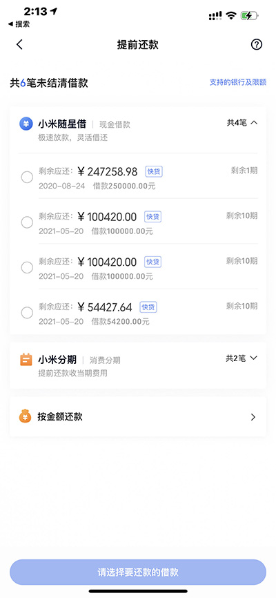 您可通过以下步骤查看贷款账单情况:打开【随星借/天星金融/小米贷款/钱包】App → 【随星借】→ 点击【借还记录】