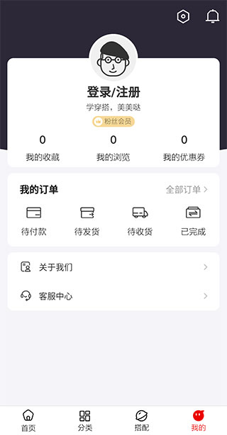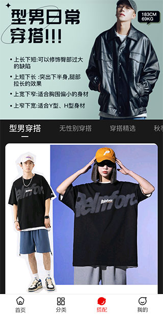 3、当我们想要学习穿搭的时候,可以打开【搭配】页面,这里为用户提供了型男穿搭、无性别穿搭、穿搭精选等多种方案。