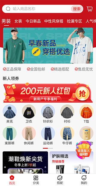 1、进入软件之后,我们就能在【首页】进行各类服装的购买,如夹克、卫衣、针织衫、衬衫、T恤等。