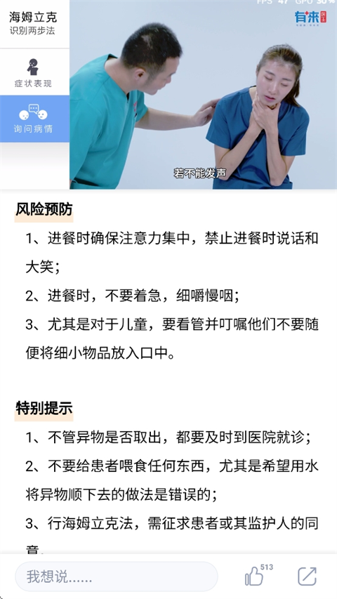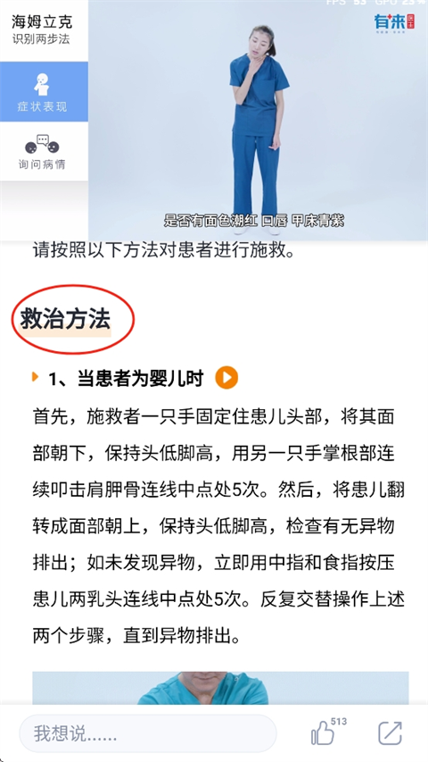 3、观看视频,有详细的海姆立克教学内容,同时可以根据下面的文字,来辨别症状。
