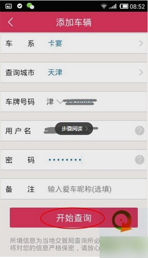 填写详细的车辆信息及用户名和密码(刚才选择的授权账号),然后点击开始查询按钮。