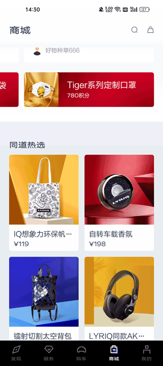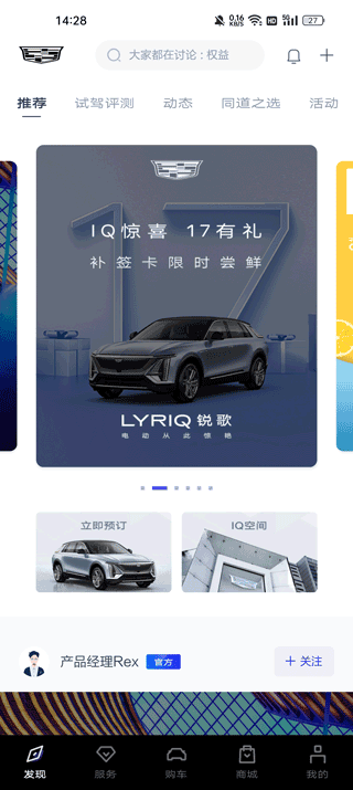 在功能方面,凯迪拉克IQ涵盖了发现、服务、购车、商城和我的等多个板块,满足用户的全方位需求。无论是查看车辆配置、预约试驾还是购买周边产品,都能轻松搞定。此外,积分兑换和成长值奖励机制也让用户体验更丰富。