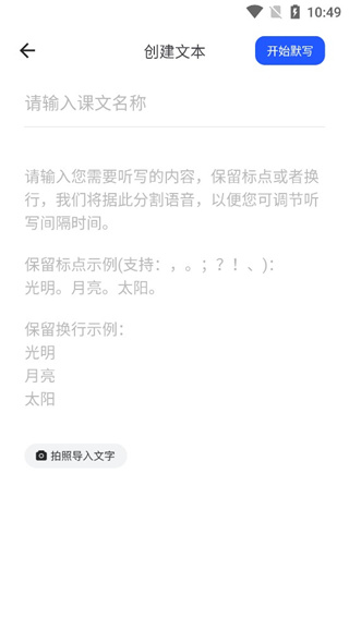在刺猬默写app找不到自己所需要的学习内容,也可以点击拍照创建。将语文课本的首页上传到平台,平台会第一时间内搜索课件库快速的为你匹配本课听写内容导出音频,同时刺猬默写app支持中小学生语文课本同步。除了课本上的内容,用户还可以自主创建录音和听写内容,创建的所有内容都会在首页显示,方便用户系统管理,系统复习。