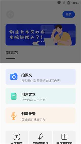 可自主创建录音支持听写,与拍课文、创建文本等方法创建的内容一并记入首页听写记录。