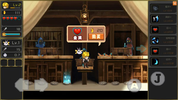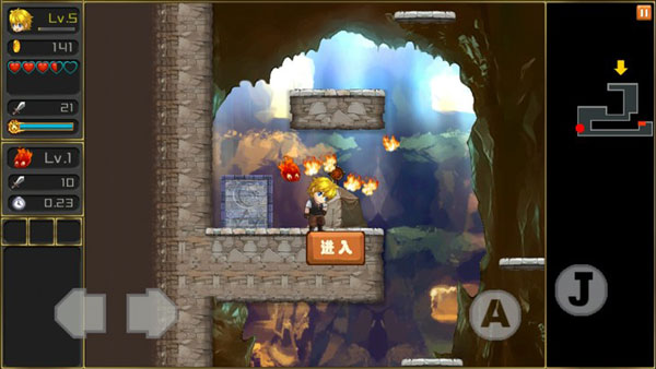 游戏操作一共有四个键,分别是左右移动,跳跃和攻击。“A”表示攻击,“J”则是跳跃。但如果只是单纯的会操作这几个键,那么这个游戏是永远也不可能过关了。我们需要学会不同的操作键的组合,前进的时候也要不停的打怪,对于那种在空中停留的怪就需要应用跳跃键。长按攻击键还可以快速攻击哦,加大杀伤力。