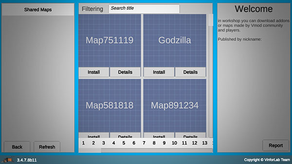 2、点击v模式沙盒上的“Addons”可以添加模组,自由开发,点击“Install”上传共享,“Details”删除模组。