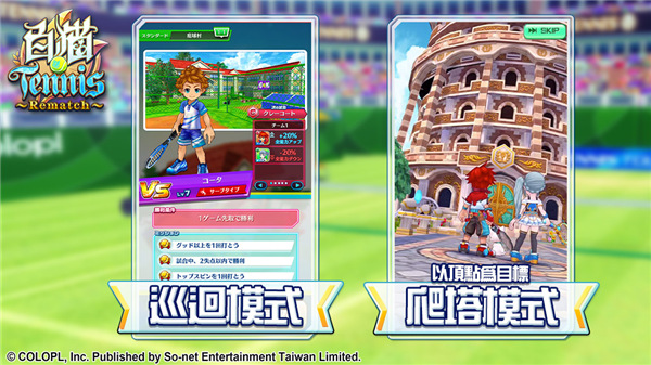 7、玩家选择“爬塔模式”,进入网球之塔中比赛,将有草地(G)、硬地(H)、红土(C)三种属性的场地在比赛中随机出现,完成比赛后玩家获得“钥匙”及报酬,然后继续登高一层与其他玩家比赛对战;期间限定期间还会有特别属性的场地追加,每上升一阶可获得一个宝箱报酬,在塔中玩家一层一层慢慢往高塔迈进,爬上 100 层高塔便是真正的赢家!