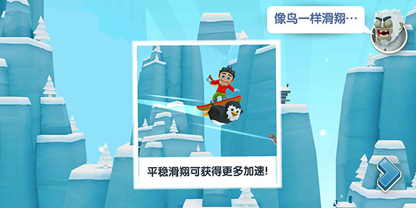 在滑雪大冒险2中,不仅可以挑战夺命竞速,还可以滑动屏幕作出特技动作!根据单、双板和坐骑的不同,特技动作也会发生改变!向前、向后、向上、向下赶紧试试吧!