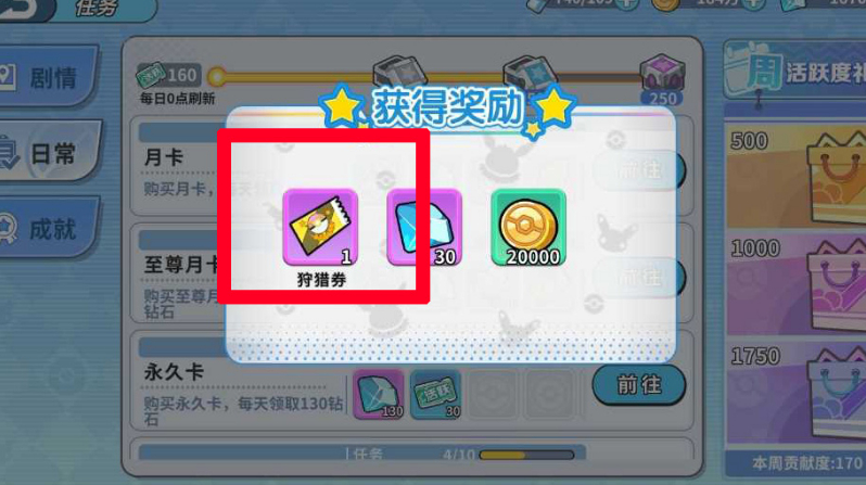 2、每日活跃度达到150分钟,即可获得一张狩猎券。