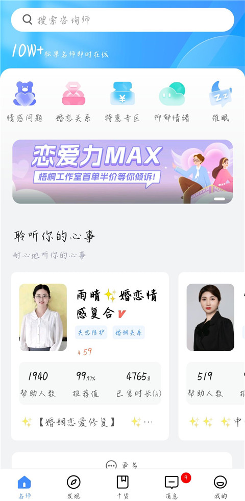 松果名师由松果倾诉内知名心理咨询师牵头,汇聚多名资深倾听者,为倾诉者提供更加专业的情感修复、恋爱答疑、家庭婚姻、亲子关系、职场关系、校园成长、人际交往、情绪疏导等各类问题的解答服务。