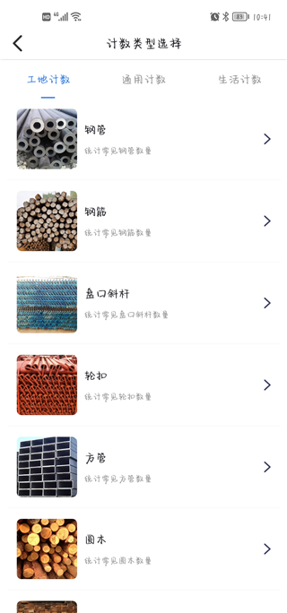 选择计数类型,拍摄或相册导入进行扫描计数,系统智能识别图片中的数量,支持计算钢管、钢筋、盘扣斜杆、轮扣、方管、圆木、方木等。