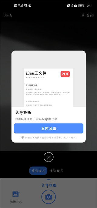 2、用户点击文件扫描,使用手机摄像头对准文件即可进行扫描,生成高清PDF文档。