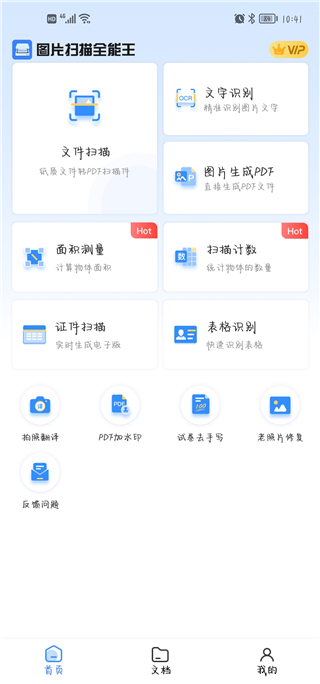 1、在本站下载安装并打开图片扫描全能王app,进入软件首页,为用户提供了文件扫描,面积测量,扫描计数等多种实用功能。