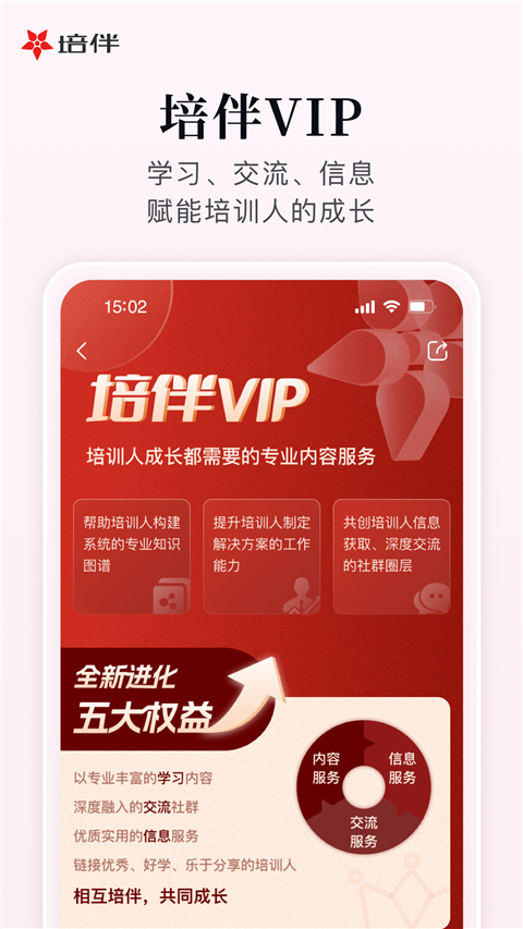 2024年培伴VIP全新进化,通过“学习服务、信息服务、交流服务”三方面,匹配六大权益帮助培训人构建系统的专业知识图谱,提升培训人制定解决方案的工作能力,与培训人一起共创培训人信息获取、深度交流的社群圈层。