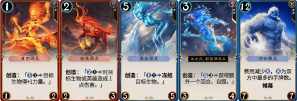 【灌塑源灵】*1,【锐角源灵】*3,【霜染源灵】*2,【乌尤尼,蔚蓝源灵王】*1:非常复杂的额外回合组件,但是各个部件拆开使用效果都还不错。只要有2个创造之后用【乌尤尼,蔚蓝源灵王】8费开启额外回合,搭配合理的打法基本等于auto win。