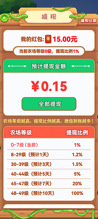 玩家点击上方提现按钮,即可开始提现,现金红包满0.3元即可提现,而且等级越高红包兑换的现金红包比例越大。