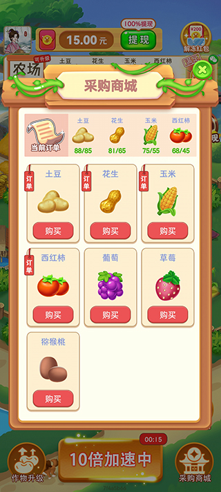 玩家点击右下角的采购商城即可进行农作物的采购,当农作物不足时可以使用红包购买农作物完成订单。