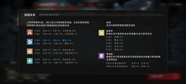 8、战斗加成:关系如下,战斗时多加注意,凑成更多加成即可。