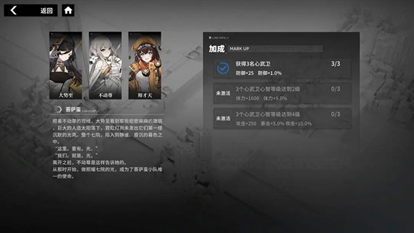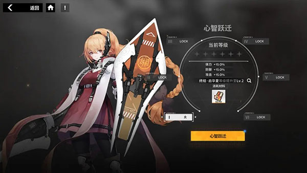 心智跃迁便是将重复角色转化的碎片用以对角色的培养,SR、R每个角色设立了四个等级的心智跃迁,SSR为六个,只能依次解锁。心智跃迁每个等级都将以百分比的形式提升体力、攻击、防御,SSR的每项心智跃迁解锁都将提升其某个技能的等级,SR级角色为前三等级提升技能等级,R级角色只有前二等级有技能等级提升。