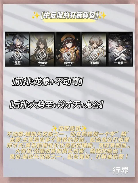 搭配思路:无妄是开局就有的心武卫,绝对的平民战神,能抗能打,给你后排稳稳的幸福。公输叠好大招,回血就会嘎嘎快,非常适合当前排。辩才天算是前期性价比最高的辅助,有控有回血。至于徵羽和赤宵,选徵羽主要是配合赤宵,赤宵输出效果非常炸裂,值得一试!