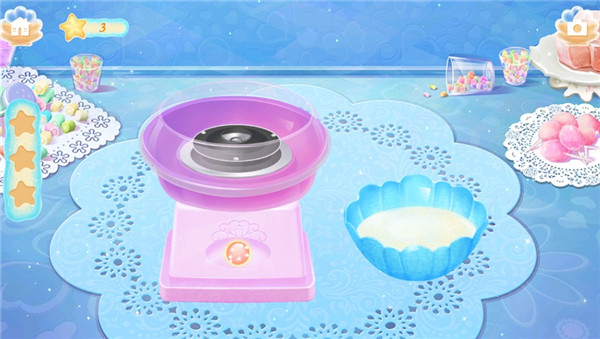 4、接下来把糖粉等材料依次倒入棉花糖机里,启动按钮,开始动手制作吧~各种形状的棉花糖球在机器里转动,用糖棒触碰对应的棉絮即可达成条件。
