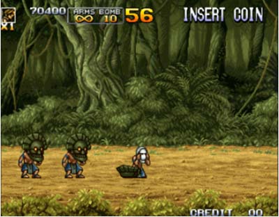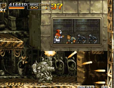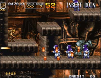 8、载具方面,本作新增了 Slug Gunner,一台装备机枪(性能与步兵时的 H 类似)与主炮的双足步行机器人,近身时使用火药钉刺进行肉搏,可以转身向后,更可在蹲下时弹出履带高速行进顺带碾压敌兵。可说是标准坦克 Metal Slug 和 3 代 Morden 军的步兵装甲 Level Armor 的终极合体进化版。