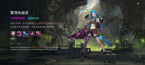 金克丝唯一的保命技能,可以在禁锢敌方的同时,打断敌方的突进(但是无法打断类似于墨菲特大招等一系列不可阻挡的技能)冷却时间很长,建议关键时候再使用。