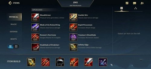 由于金克丝是一位物理射手英雄,所以按常规的暴击→攻速→吸血的出装路数走就好了,如果对面输出太高了,可以将疾射火炮替换成复活甲,出装顺序如下图;