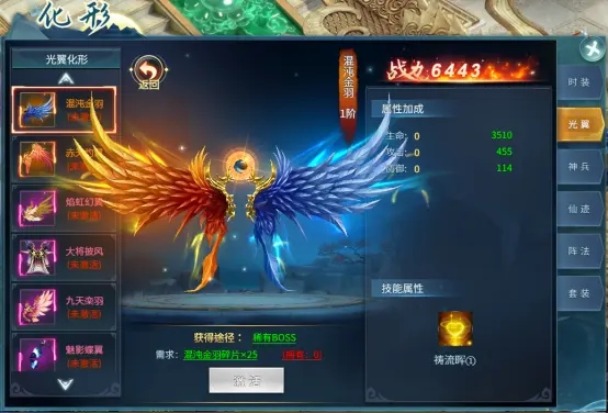 使用光翼碎片或者激活卡激活光翼,获得酷炫光翼和超强属性,技能。已激活光翼可以用光翼升星石升级,提供更强属性。光翼属性叠加生效,切换光翼外观属性不变动。