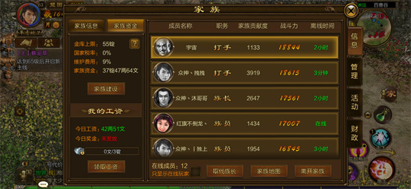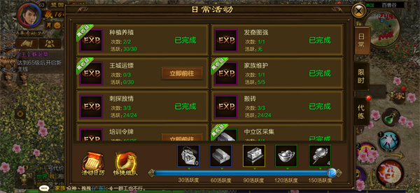 1、刺探、太庙搬砖、王城运镖一定要跟着家族里面带队做任务的大佬,不仅做任务轻松,还有经验加成。