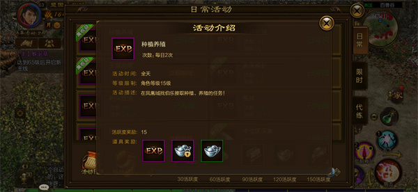 种植养殖任务也是我们不容错过的资源获取方式之一,每个超过15级的小伙伴每天都能够进行2次任务,只需前往凤凰城找到伯乐接取种植和养殖任务并根据提示就能轻松完成,不单单能够获得大量经验,还能够获得数量可观的绑银和银两哦。