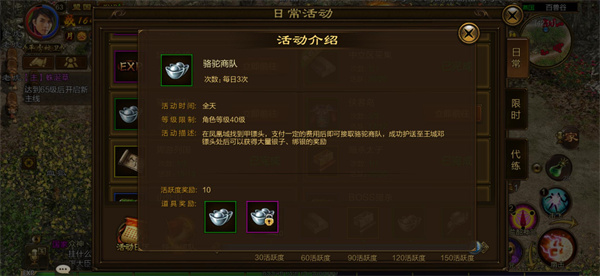 骆驼商队任务也是我们不容错过的资源获取方式之一,每个超过40级的小伙伴每天都能够进行3次拉骆驼的任务,只需要前往凤凰城找到甲镖头接取你心爱的小骆驼,然后根据任务提示就能轻松完成任务,任务完成后可以获得数量可观的不绑定绑银和绑定绑银,当然拉骆驼的过程中也是需要有人陪伴的,因为会有其他国家的玩家为了数量可观的绑银去砍你的骆驼,保护好自己的小骆驼是你首要的责任。