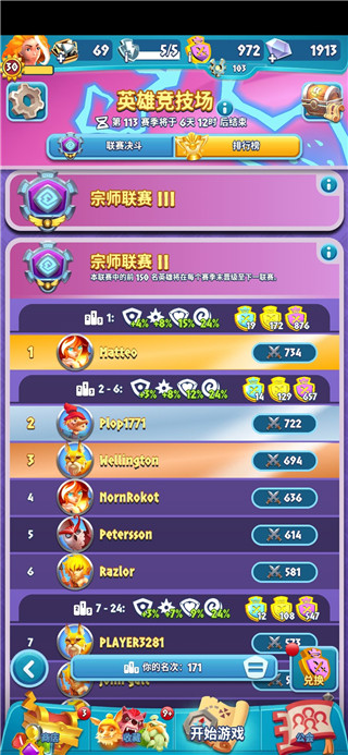 3、建议打到这个段位后停留,如果再往上打到宗师联赛三,将会很困难,只能垫底然后掉回宗师二,我们可以联赛初期尽量提升自己名次,拿到更多的每日结算,在赛季结束时,保持自己名次在150-400就可以继续停留在这个阶段,如果名次高了可以适当输掉到这个名次,还有一点很关键,每赛季结束大约是晚上22:15,可以把握这个时间,快速打两局拿个第一名,会获得大量的神话币。