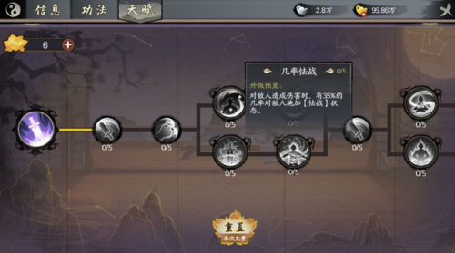 侠客的天赋特点不同,掌门可以根据侠客的天赋特点,在天赋树中点出战斗中的其他效果,或点出侠客自身天赋效果增强。