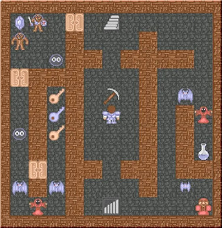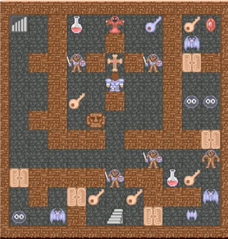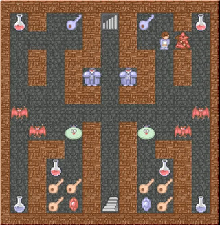 4楼也一样,直接杀上5楼,右下有一把剑,杀过去,剑的左侧是暗墙,拿了剑,此时是20攻击10防御,往上走要打小蝙蝠。来看一下小蝙蝠的属性,血35攻38防3,20攻击一次可以打它17点血,要3次才能打死,则勇士会被它攻击两次,损失(38-10)*2=56点血。如果是21点攻击,一次打18点血,只需要2次就打死,只会损失28点血。这里21攻击就是一个关键的临界点。