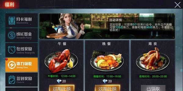 然后每天还可以领三次体力,同样也可以购买,如果忘记领了也没事,只需要20钻就可以补领了~每天的超值抢购如果有钱的话也可以买下,因为里面的东西其实确实不错,另外如果是想长期玩下去地话,成长基金和月卡是必须的,至于VIP等级没有必要太在意,因为不仅每天登录会送VIP经验,活跃宝箱也会送,所以不必太过在意。