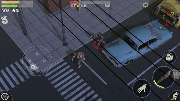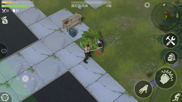 一:新手在进入游戏中需要控制屏幕左侧的摇杆来控制角色移动,在屏幕的右下角正中间的拳头图标是攻击按键,点击可以攻击僵尸。旁边的小巴掌图标是拾取和收集按键点击可以进行搜索箱子,拾取物资,砍伐树木和矿物等。