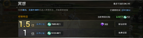 有时候挂机怕掉线,这个完全不需要担心,在我们离线或者无操作30秒之后会进入冥想状态,最多可积累24小时的经验,用紫钻可以1.5倍领取,前期战力很低的时候,可以通过冥想来获取经验,因为冥想得的经验会比挂机得的经验多
