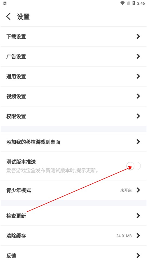 2、进入设置页面,开启测试版本推送。
