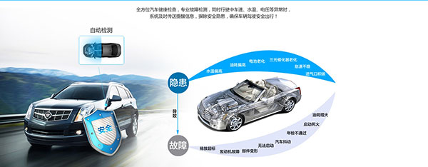 1、360°全车体检隐患早知到,全方位汽车健康检查,专业故障检测,同时行驶中车速、水温、电压等异常时,系统及时传送提醒信息,摒除安全隐患,确保车辆驾驶安全出行!