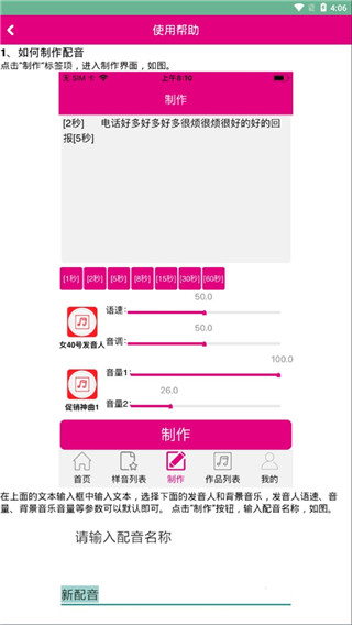 在上面的文本输入框中输入文本,选择下面的发音人和背景音乐,发音人语速、音量、背景音乐音量等参数可以默认即可。点击制作按钮,输入配音名称。