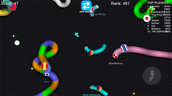 在游戏的过程中你需要不断的吃掉落的光点,注意在吃光点的同时注意不要碰到别的蛇的头部,不然游戏就结束了哦。另外,玩家还可以自定义小蛇的皮肤,当你的小蛇拥有独一无二的皮肤时,在赛场上你可以更好的观察到它的活动,感兴趣的小伙伴还在等什么,快来下载蛇蛇大作战,让你体验不一样的贪吃蛇!