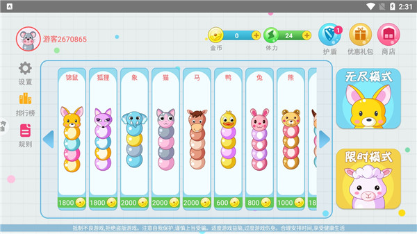 1、下载进入萌宠贪吃蛇手游,游戏中拥有无尽和限时模式,选择你的皮肤开始游戏吧;