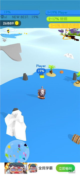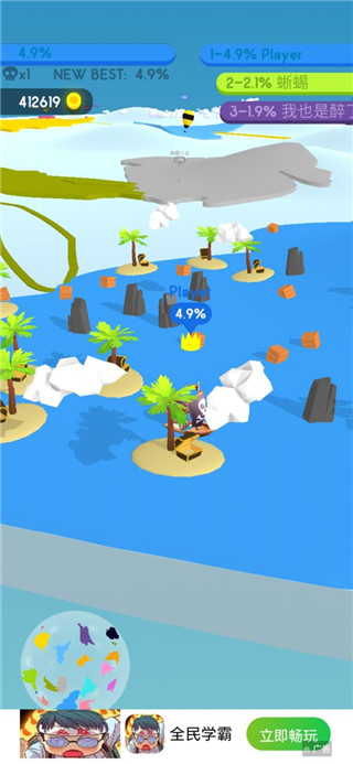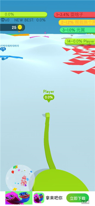 圈出一块地最新版,这是一款io类的竞技手游,游戏在画面上采用了3D卡通风格,游戏简单有趣,画面精致清晰,玩法丰富,在这里玩家开局只有一个很小的据点,需要通过操纵一个从据点中跑出来的小方块,不断的让方块画出跟据点一起的闭合圈圈,圈到的地就会变成自己的颜色,也就是自己的地盘安利,圈得越多,胜利就离自己越近!同时在圈出一块地最新版游戏中玩家在扩张的时候需要注意不要被敌人碰到没有链接完整的线,否则游戏会结束。除此之外,在圈出一块地游戏中还对应加入反吞并机制,可以割地吞并敌人,也会被敌人撞击摧毁移动留下的割地虚线,从而直接退出割地竞争。以割地时的移动操作诠释技,以领地多寡和生死诠释竞,要么竞技得胜,要么退出竞争,非常残酷。计算得分时,利用反吞并机制消灭敌人的得分,甚至是割地得分的三倍有余。喜欢的玩家还在等什么,快来下载体验一下试试看吧!