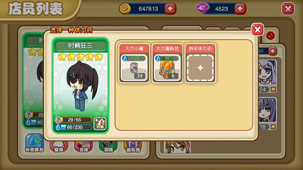 店员个人状态均可单独查看,给体力不足的店员补充体力,体力药水可以在商店购买