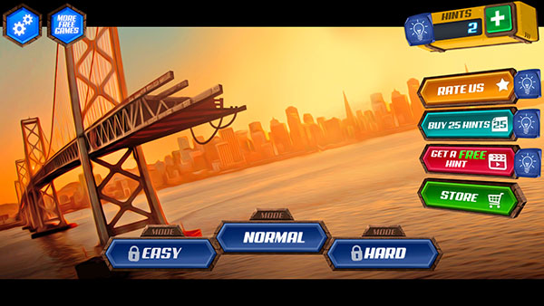 游戏有多种场景,地面关卡、太空关卡等你来解锁,还有轻松模式让你轻松玩游戏,轻松建桥!