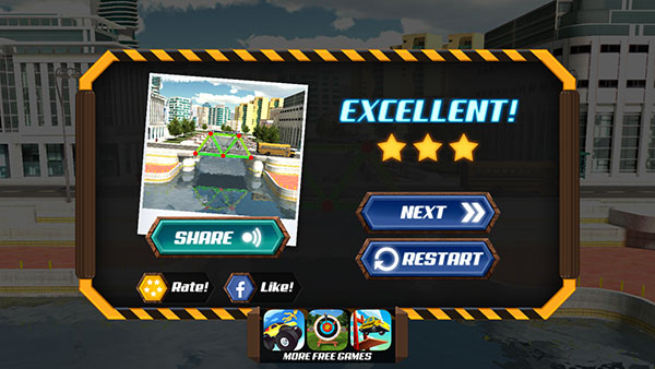 正如上述所言,尽管桥梁设计师游戏的玩法不算太难,但是如果你想要玩得更好,不断的刷新已有的记录,那么你确实需要下一番苦功。毕竟如何能在有限的材料中建造出一座座坚固又耐用的桥可是每位设计师所毕生追求的梦想,无一例外。前期的话,材料种类少,桥的长度也比较短,玩家们的通关难度就比较小。但是一旦到了桥梁设计师游戏的后期,那么玩家们所要思考的内容就会变得更多,稍不留意就可能导致桥面坍塌。不过好在这只是在游戏中,玩家们有着无限试错的机会,一次不行,多来几次总能成功。相信你能够在这一次次的实践中总结出其中的技巧,然后以最少的材料刷新纪录,通过一个又一个的关卡。喜欢此类益智玩法的小伙伴杆件来下载试试吧!